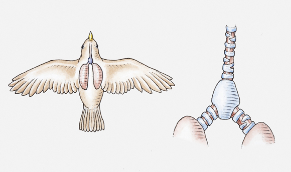 At the point where the windpipe divides is situated the bird’s sound producing organ, a “voice box” called the syrinx. Humans have no syrinx but a larynx instead. The larynx is a cavity in the throat and contains our vocal chords. The avian syrinx is called a lower larynx, being differently situated at the other end of the windpipe. It is as if the human larynx were positioned in the chest.