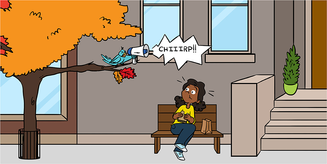 to be heard above the noise [4]. Scientists are currently researching if a male’s ability to find mates in the city is affected by these changes in their songs, since those changes might come at a cost [4]. For songbirds, living near low-pitched traffic noise and needing to sing louder or at a higher pitch can be stressful [5]. This would be a little bit like using your “outside voice” all the time; your throat would end up sore! As a result of the stresses of urban life, scientists have seen that songbirds often choose to move their homes outside the city. The number of species living in urban areas with significant background noise has decreased, which could be related to their songs being drowned out by the city sounds [6].